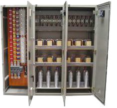 Capacitor banks (for Power Factor correction) up to1000 KVAR in any number of steps are also available from SFEI to complement our range of LV Switchgear. Capacitor banks are available with harmonic filtration (passive) as an option should they be required due to harmonic generating loads such asDC and motor driven equipment. Power Factor correction and harmonic filtration equipment is pre-programmed to operate as required by one of our trained control engineers prior to testing, delivery and commissioning.